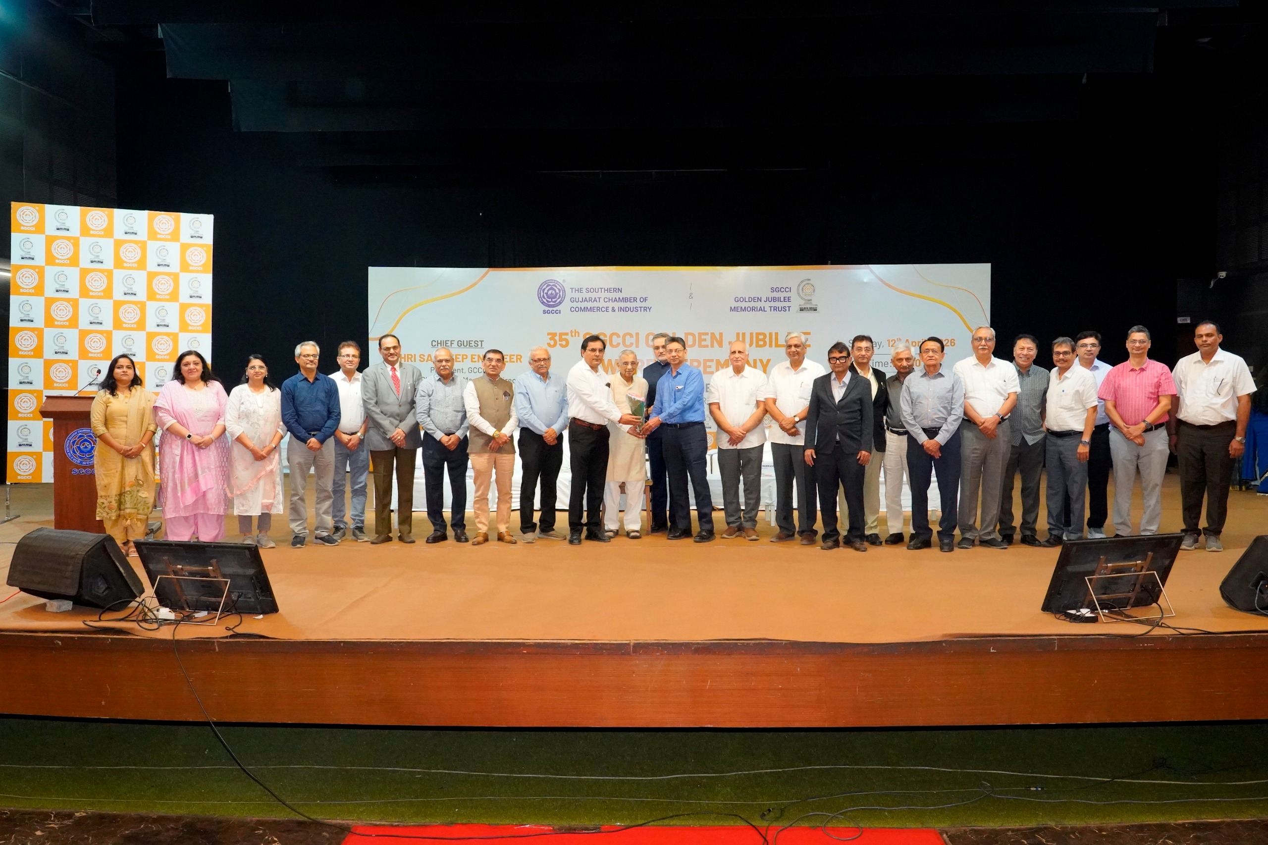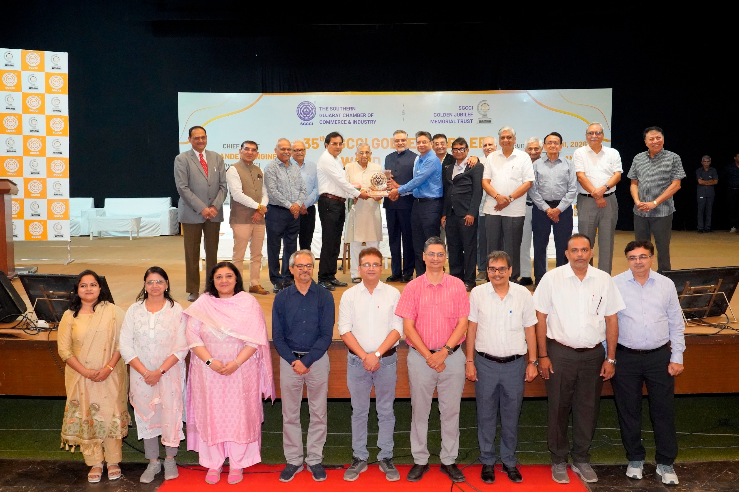 સધર્ન ગુજરાત ચેમ્બર ઓફ કોમર્સ એન્ડ ઇન્ડસ્ટ્રી (SGCCI) દ્વારા 12 એપ્રિલ, 2026ના રોજ યોજાયેલા વાર્ષિક એવોર્ડ સમારોહમાં SGCCI ગોલ્ડન જુબિલી મેમોરિયલ ટ્રસ્ટ દ્વારા સાર્વજનિક યુનિવર્સિટીના સંલગ્ન કોલેજ, સાર્વજનિક કોલેજ ઓફ એન્જિનિયરિંગ એન્ડ ટેક્નોલોજી (SCET) ને “મહાવીર સિન્થેસિસ એવોર્ડ ફોર આઉટસ્ટેન્ડિંગ ઇન્સ્ટિટ્યૂટ/કોલેજ ઓફ એજ્યુકેશન 2024–25” એનાયત કરવામાં આવ્યો હતો।